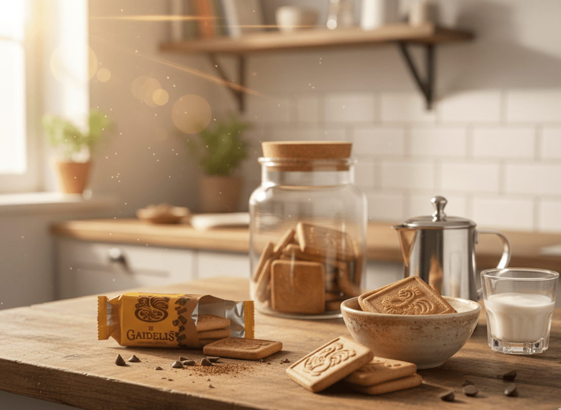 Hell erleuchtete Küche mit Gaidelis Keksen in einem Vorratsglas und auf dem Holztisch, im Hintergrund eine Küchenzeile.